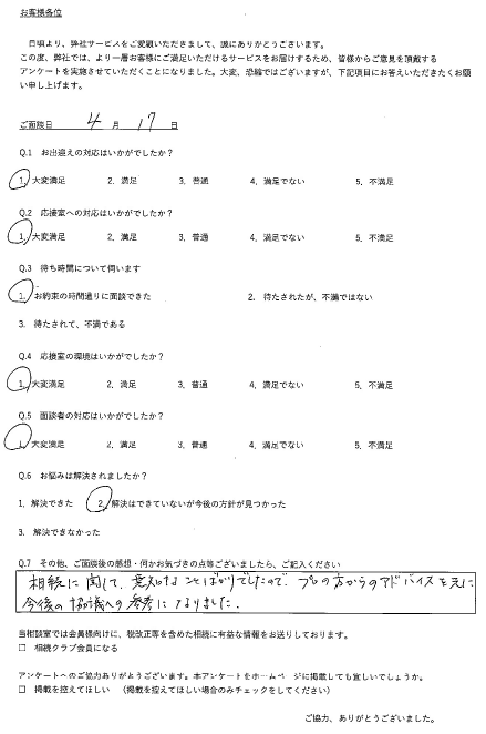 A7、相続に関して、無知なことばかりでしたので、プロの方からのアドバイスを元に今後の協議への参考になりました。